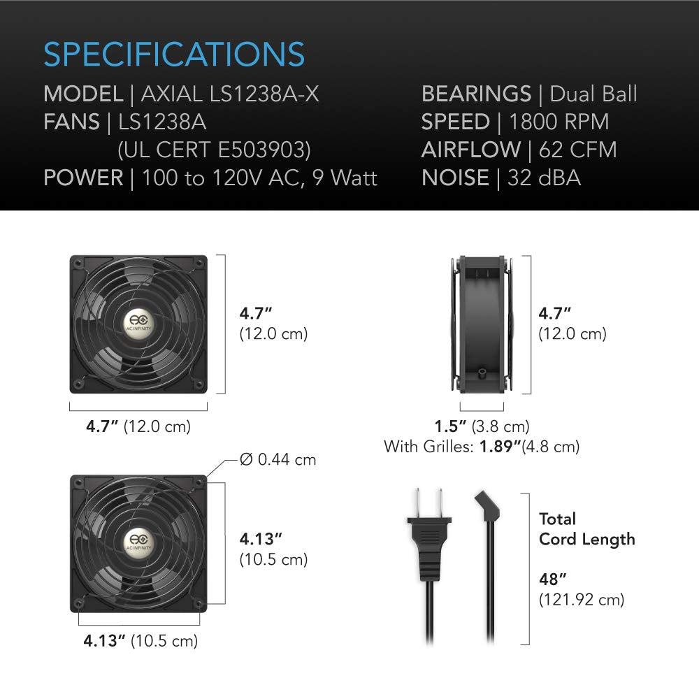 AC Infinity AXIAL LS1238, Quiet Muffin Fan, 120V AC 120mm x 38mm Low Speed, UL-Certified for DIY Cooling Ventilation Exhaust Projects