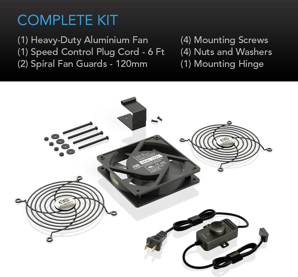 - Kit includes heavy-duty aluminum fans, wire guards, mounting screws, swivel brackets, and power cord.