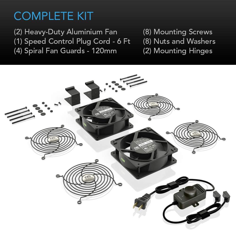 - Kit includes heavy-duty aluminum fans, wire guards, mounting screws, swivel brackets, and power cord.