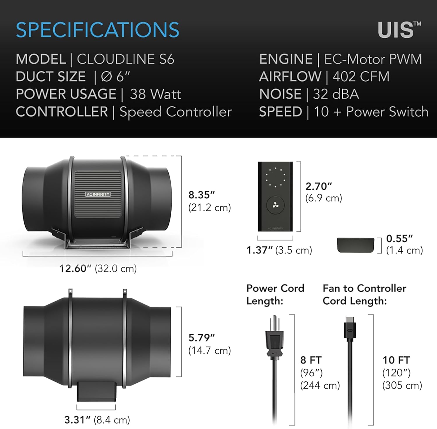 AC Infinity CLOUDLINE PRO S6, Quiet 6” Inline Duct Fan with Speed Controller - EC Motor Ventilation Exhaust Fan for Heating Cooling Booster, Grow Tents, Hydroponics