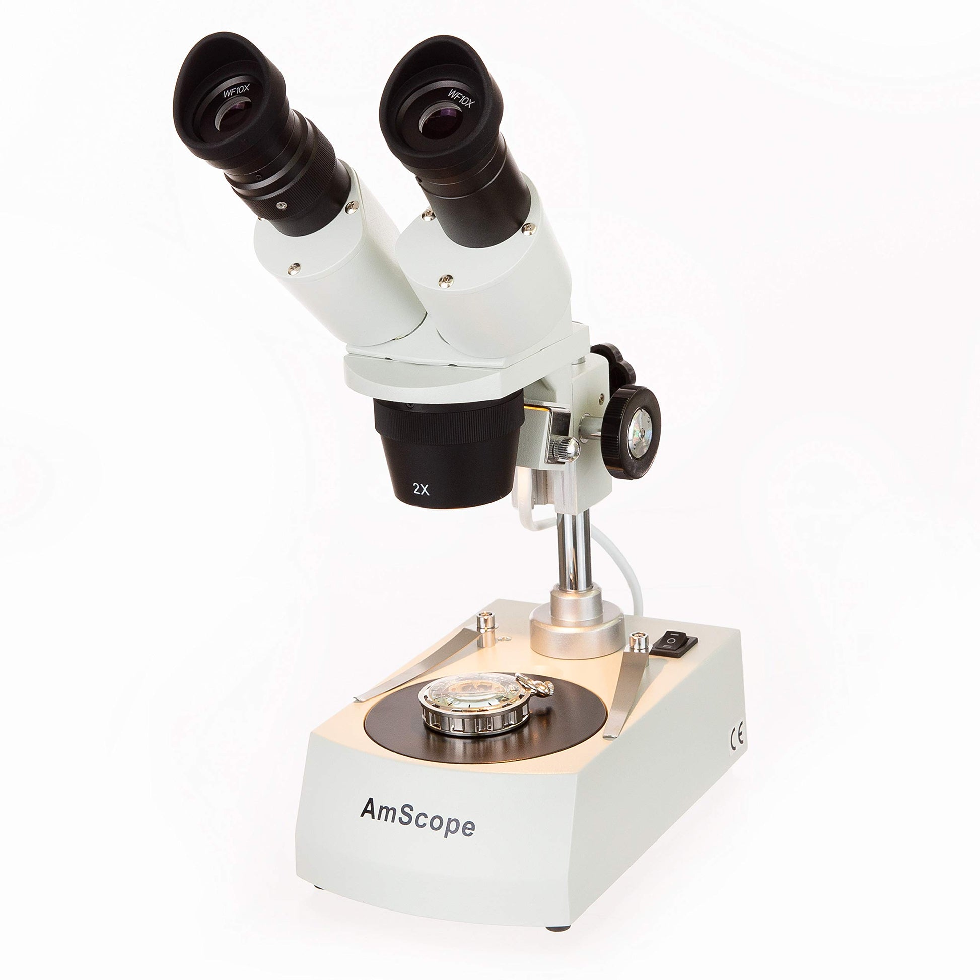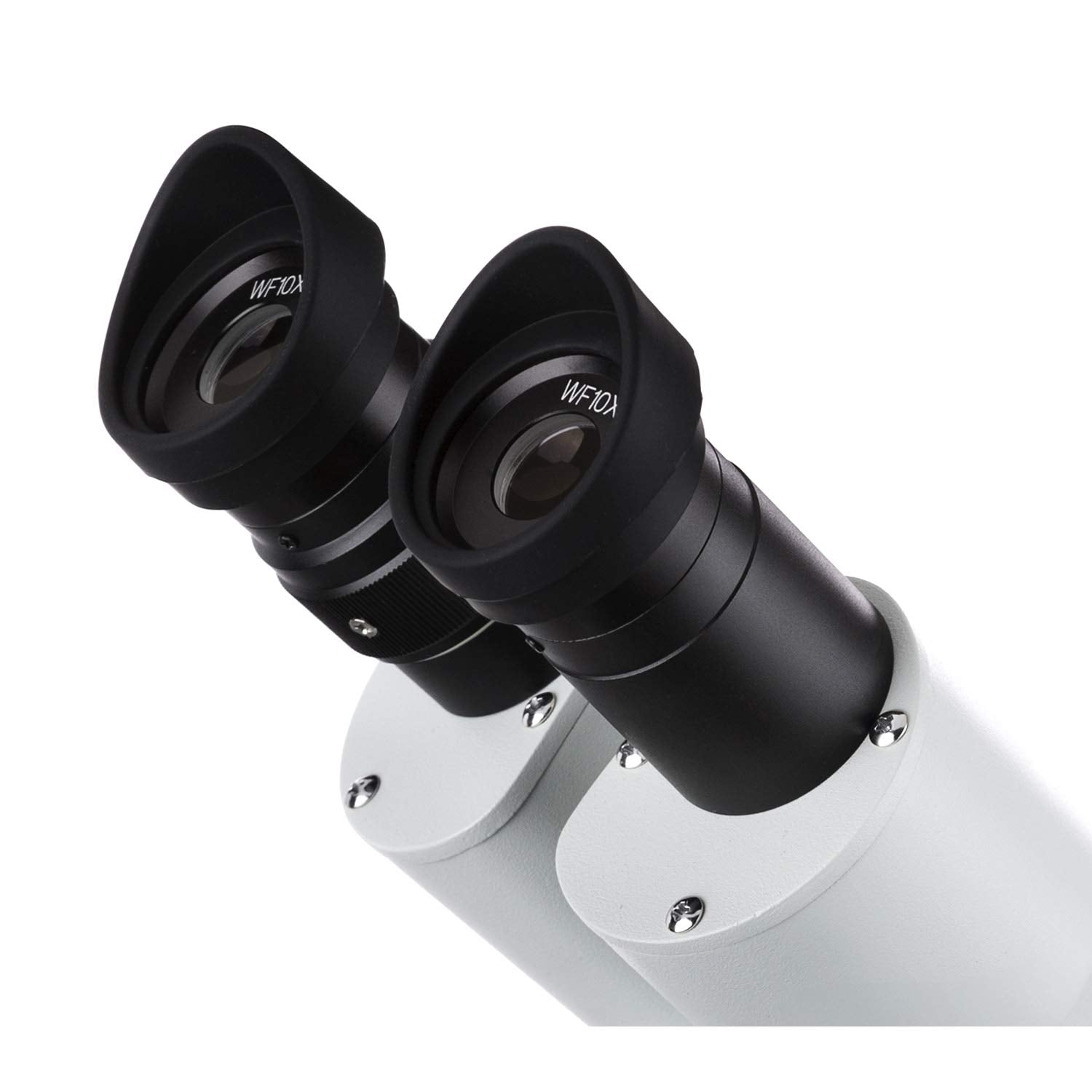AmScope SE306R-PZ Forward Binocular Stereo Microscope, WF10x and WF20x Eyepieces, 10X-80X Magnification, 2X and 4X Objectives, Upper and Lower Halogen Light Source, Pillar Stand, 120V , White