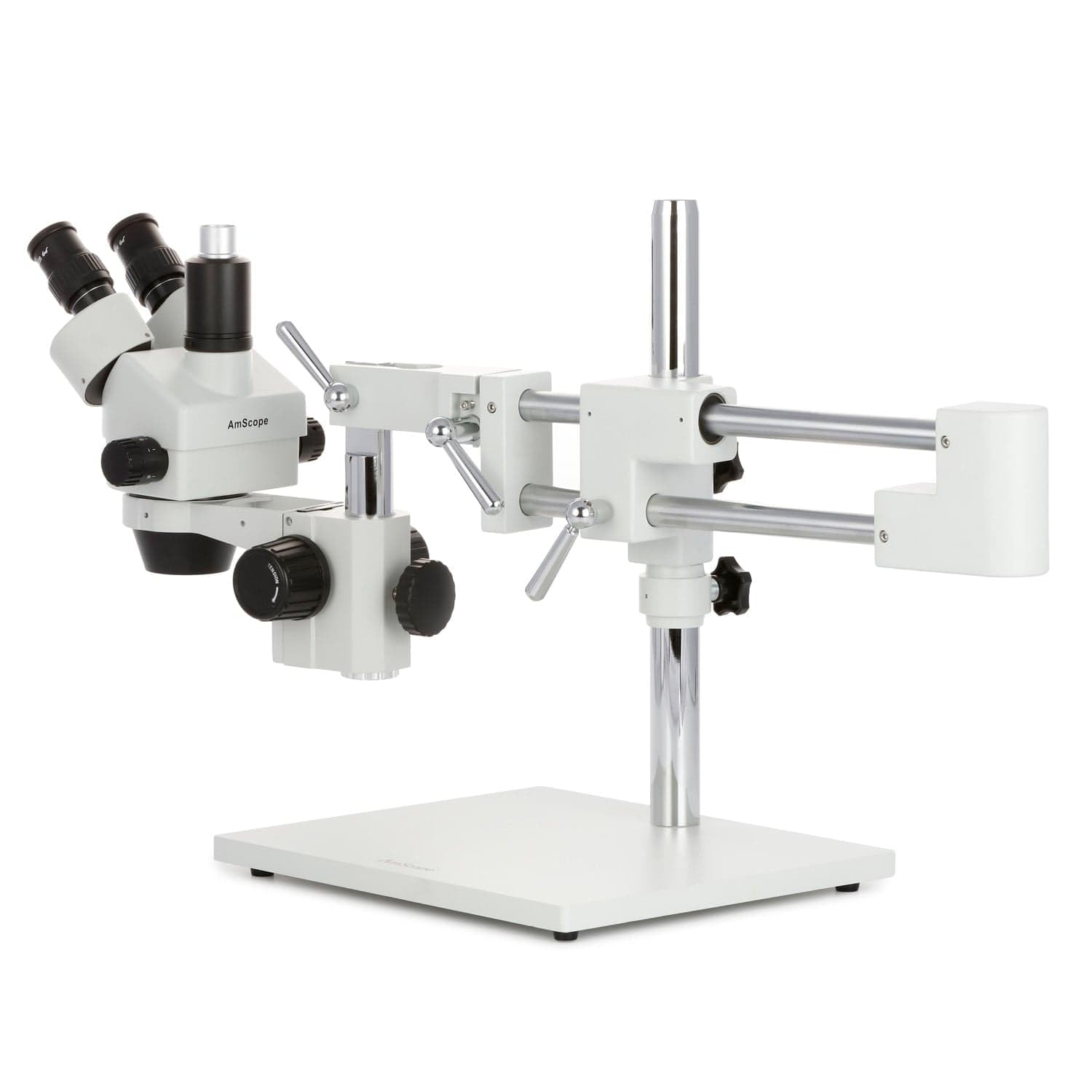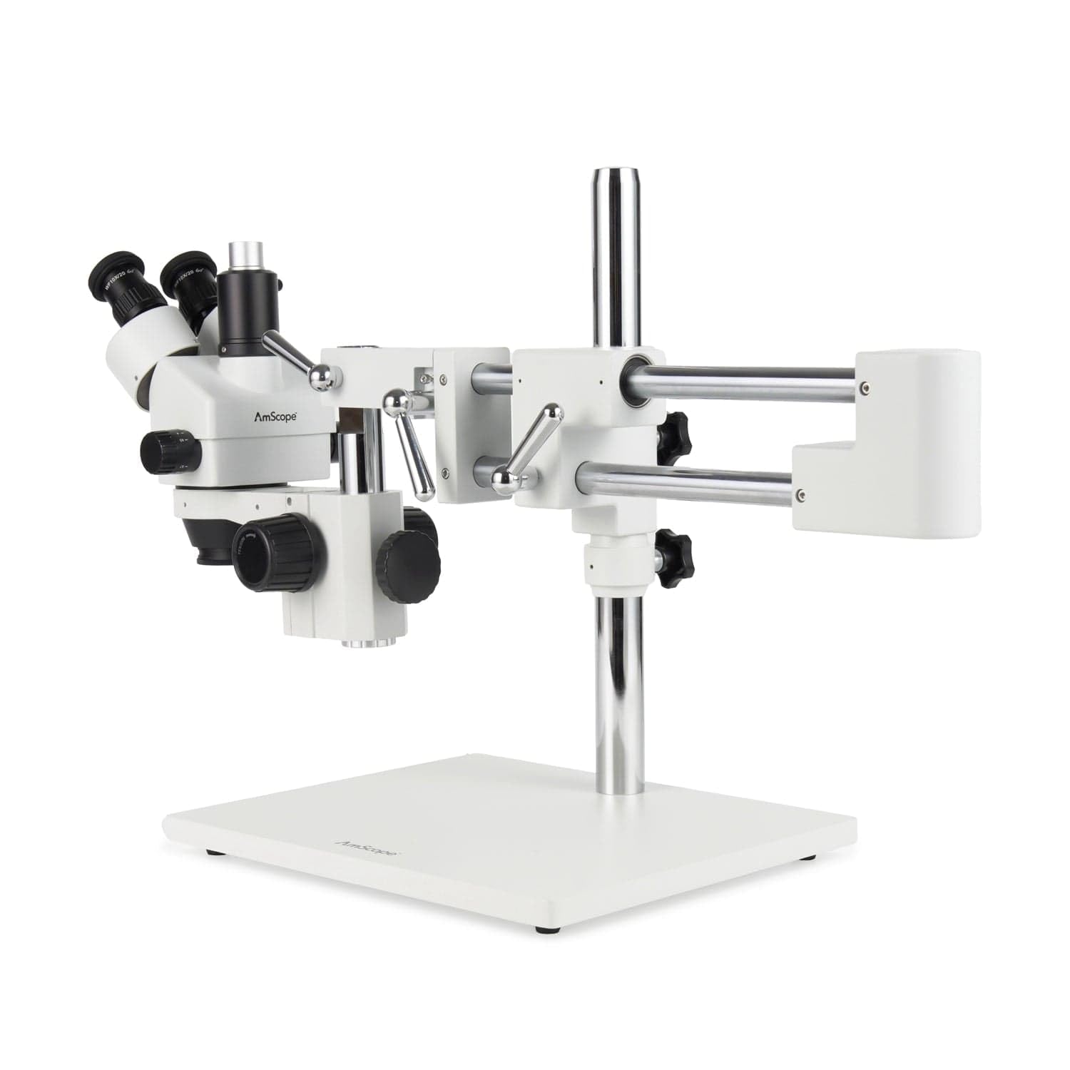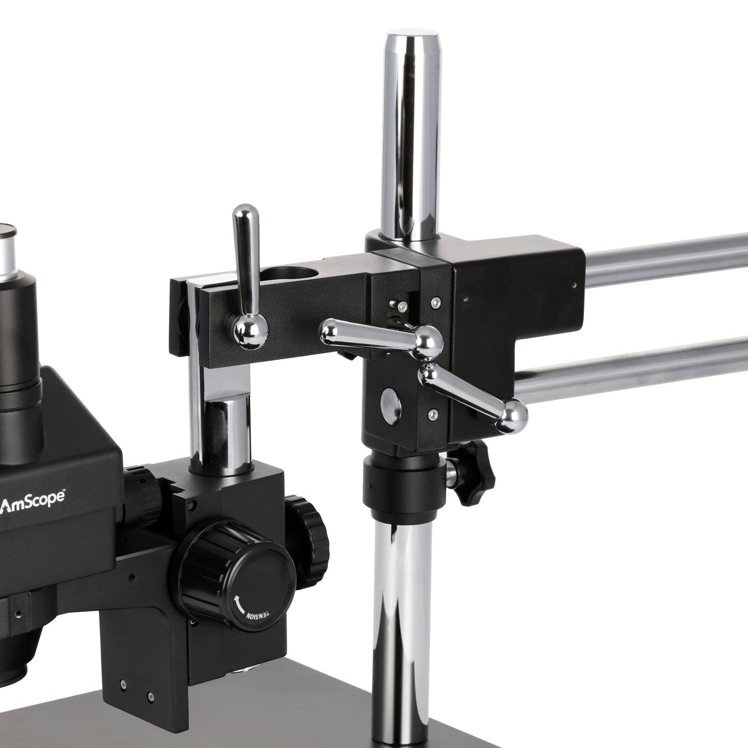 - AmScope SM-4TZ-144A stereo zoom microscope with double-arm boom stand