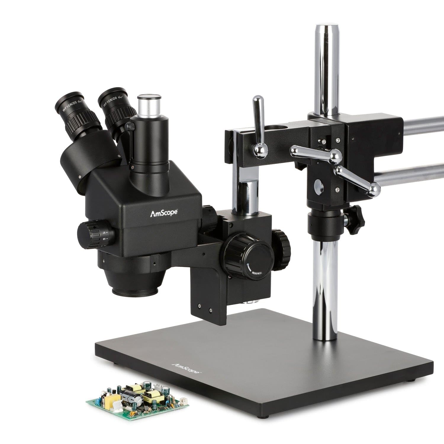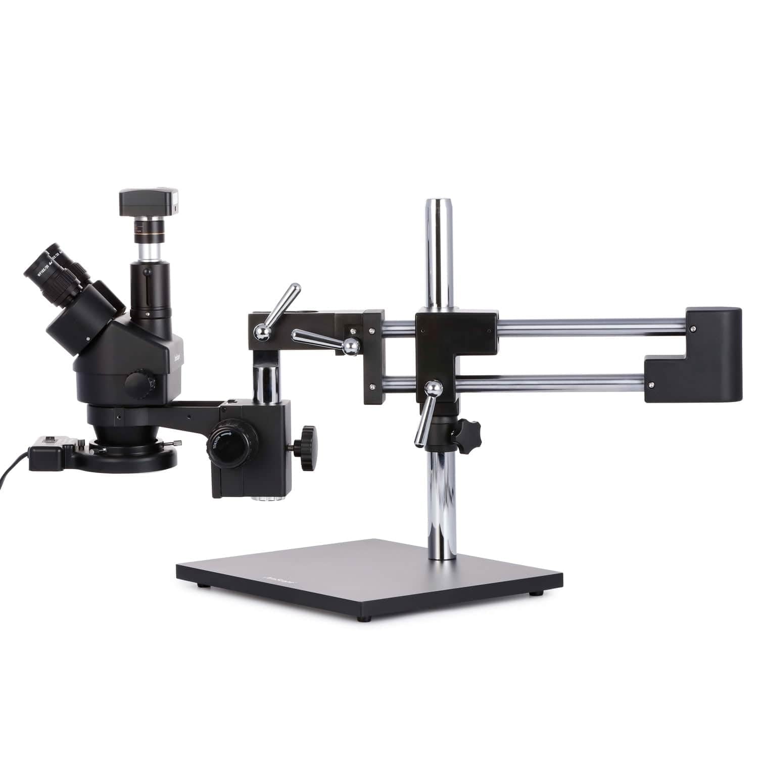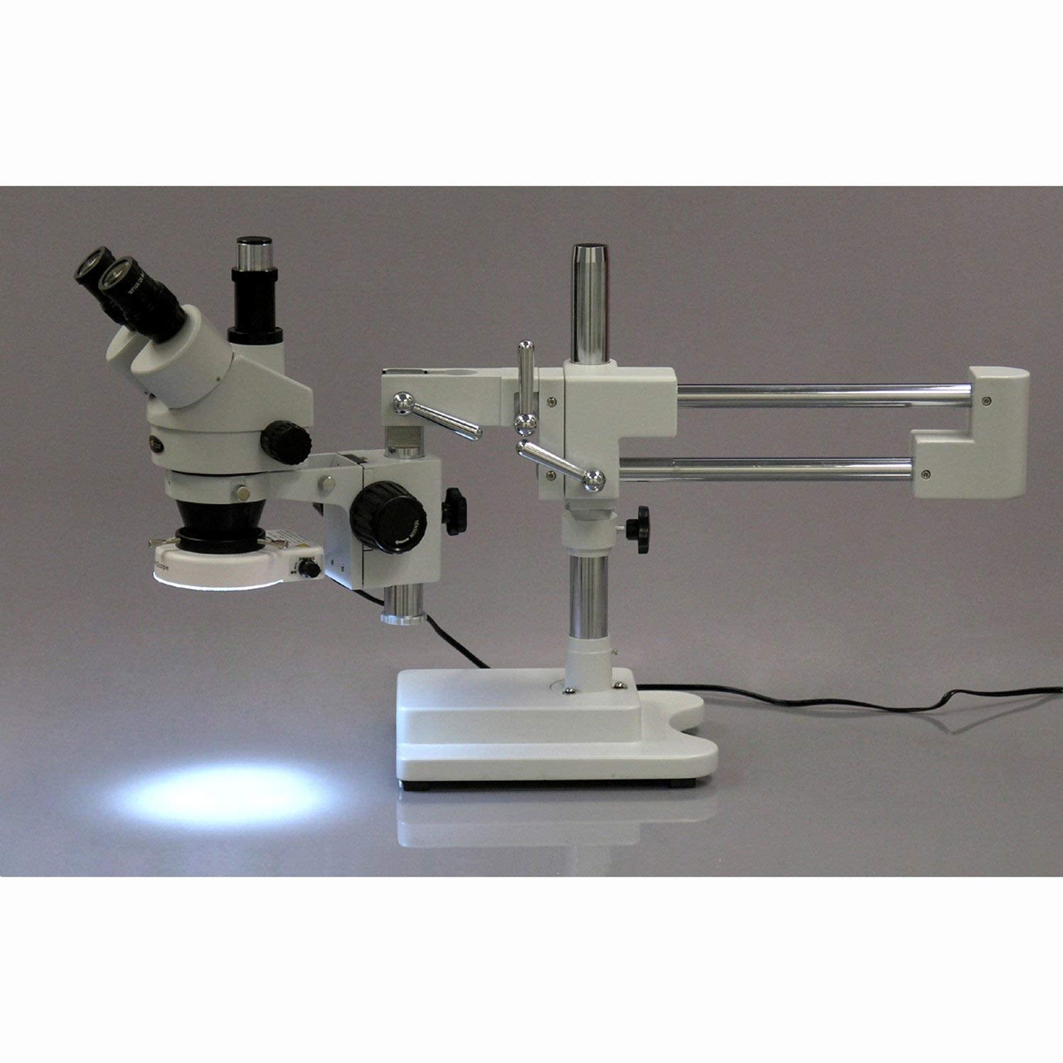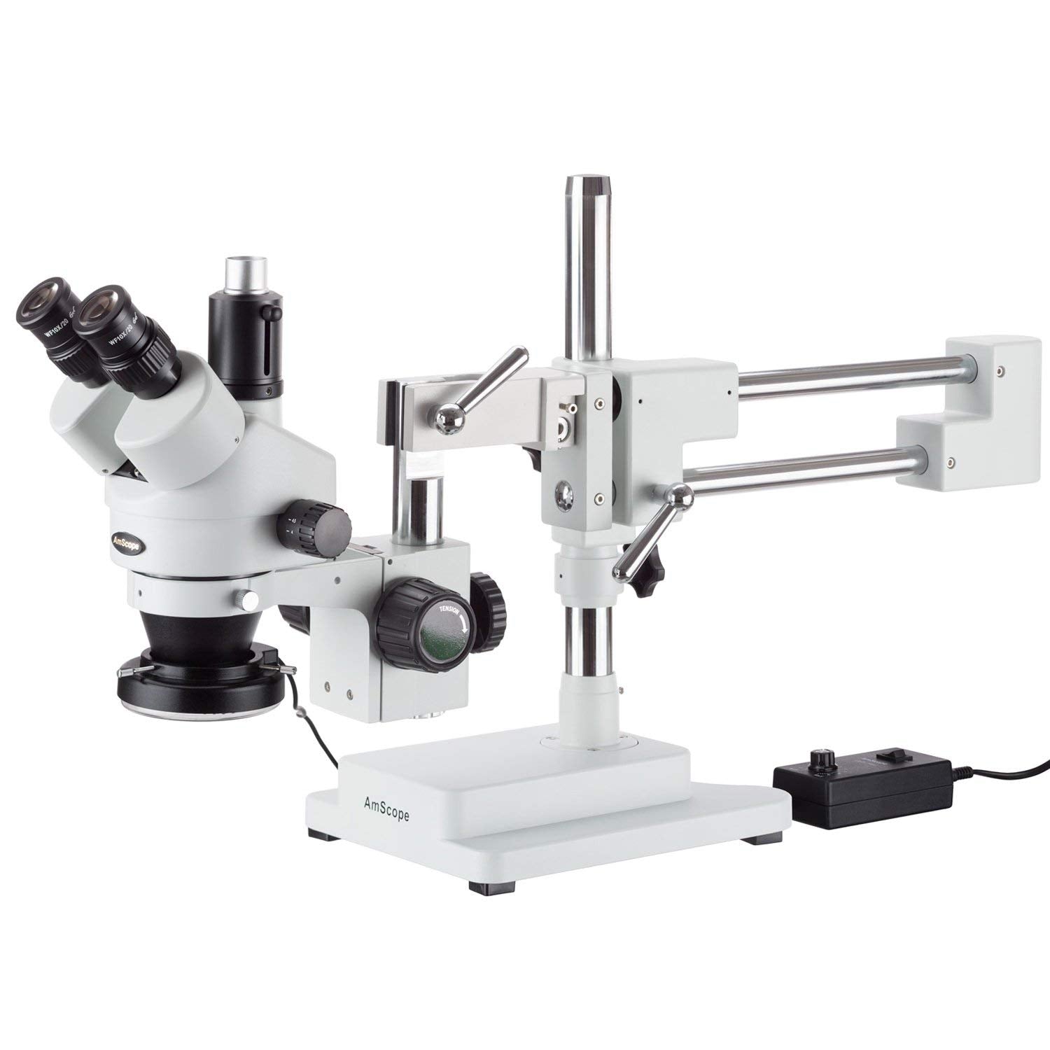 - AmScope SM-4TZ-144A stereo zoom microscope with double-arm boom stand