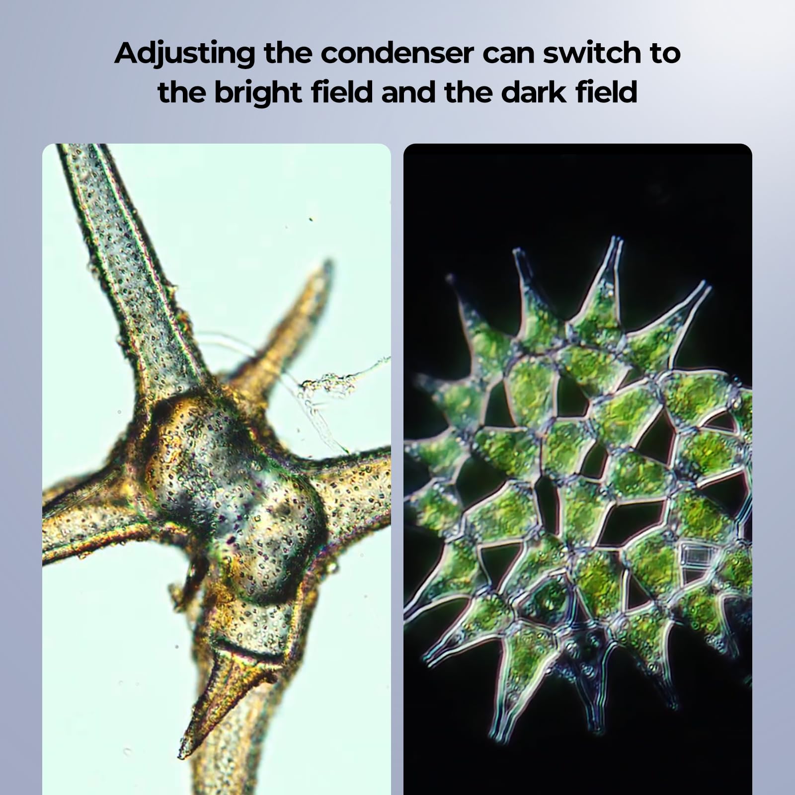 - [Brightfield & Darkfield]: NA 1.25 Abbe condenser with iris diaphragm, Support brightfield and darkfield.【Noticed: Because different types of dark fields have high requirements for light, this dark field microscope is for researching organisms and cells ,not for live blood】