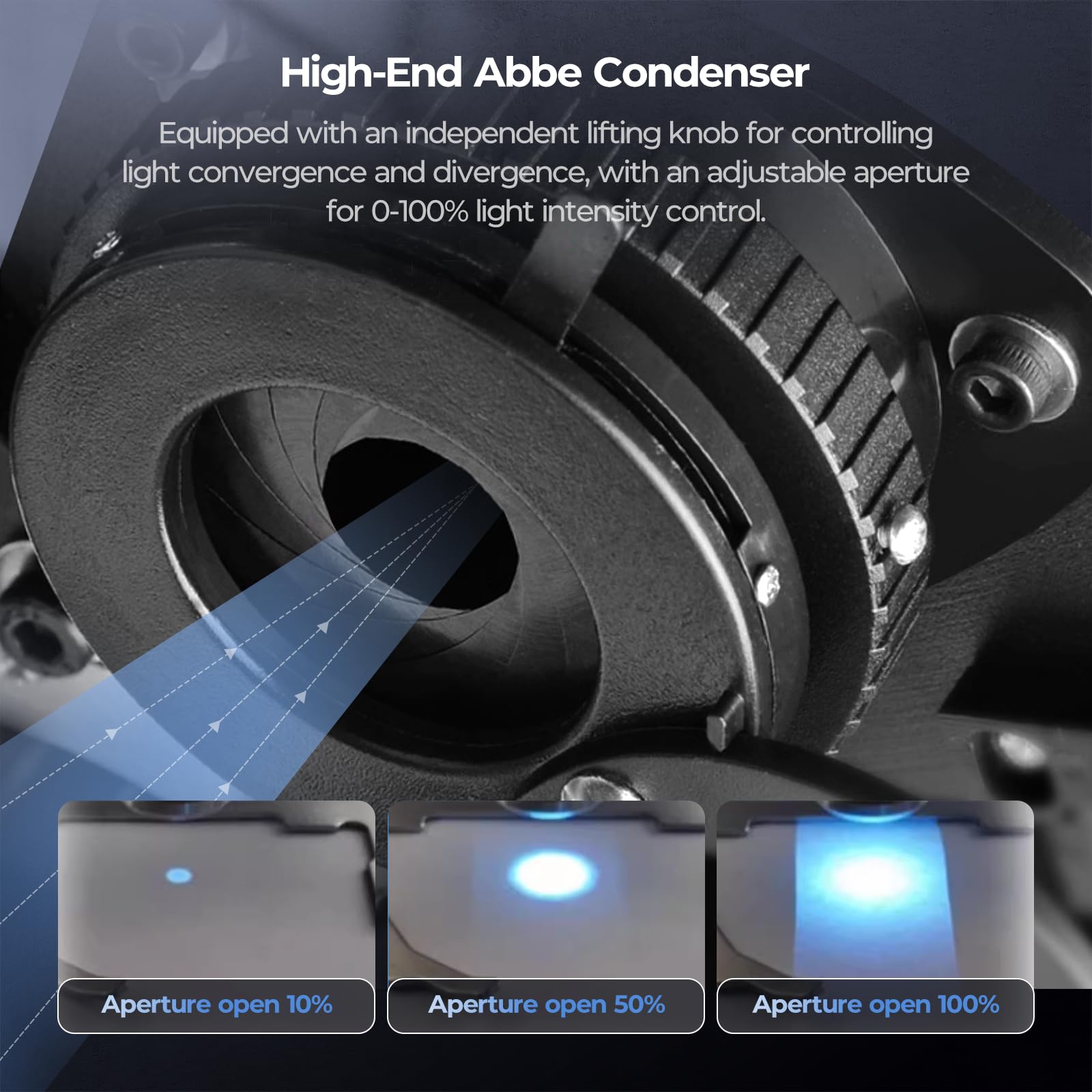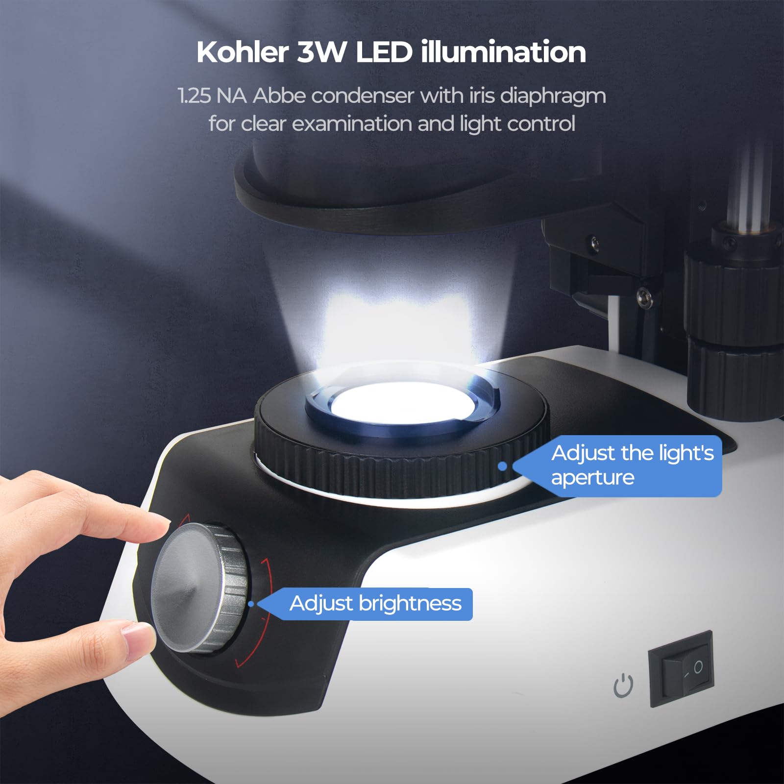 - [LED illumination & Condenser]: LED illumination, and 1.25 NA Abbe condenser with iris diaphragm for clear examination and light control.