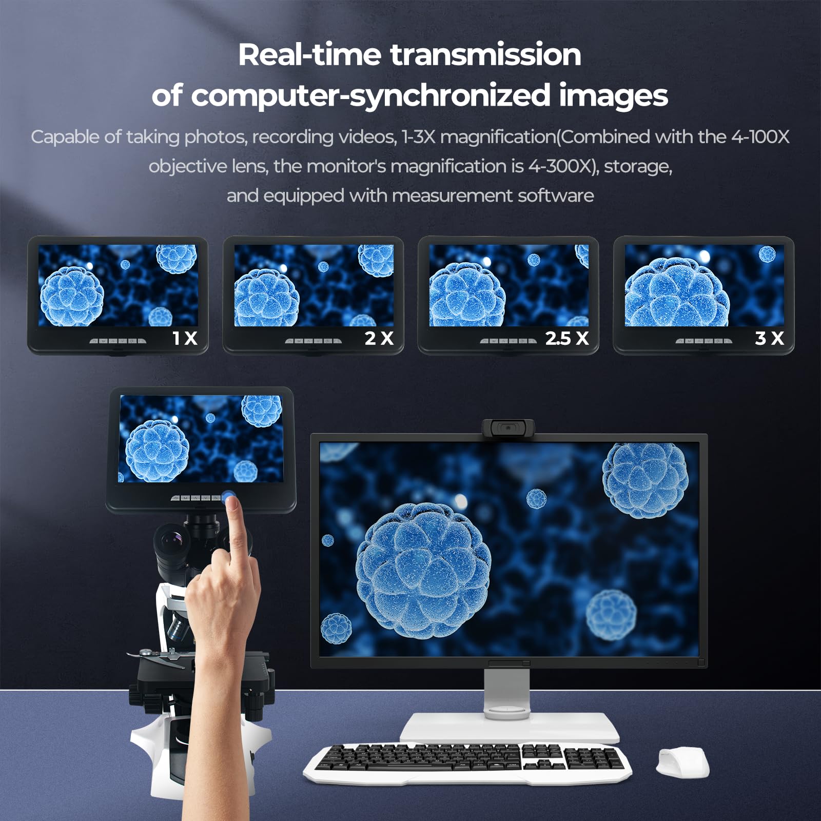 - [Eyepieces & LCD Screen]: Equipped with WF10X/16X/25X glass eyepieces fixed at an ergonomic 30-degree tilt to reduce neck strain, easily adjustable for different interpupillary distances without losing focus, 5MP E-eyepiece and 360 degrees 7" LCD display allows you to get a larger field of view directly from the screen without an external large screen display, provide a more comprehensive view and enable sharing. 4 Achromatic objectives offer 4x 10x 40x(s) 100x(Spring Oil).