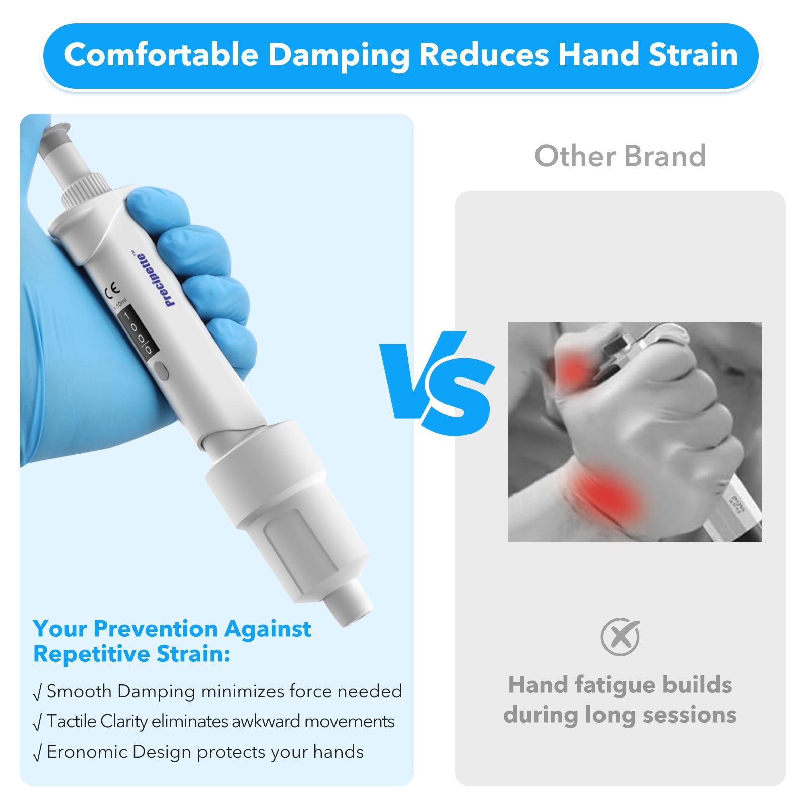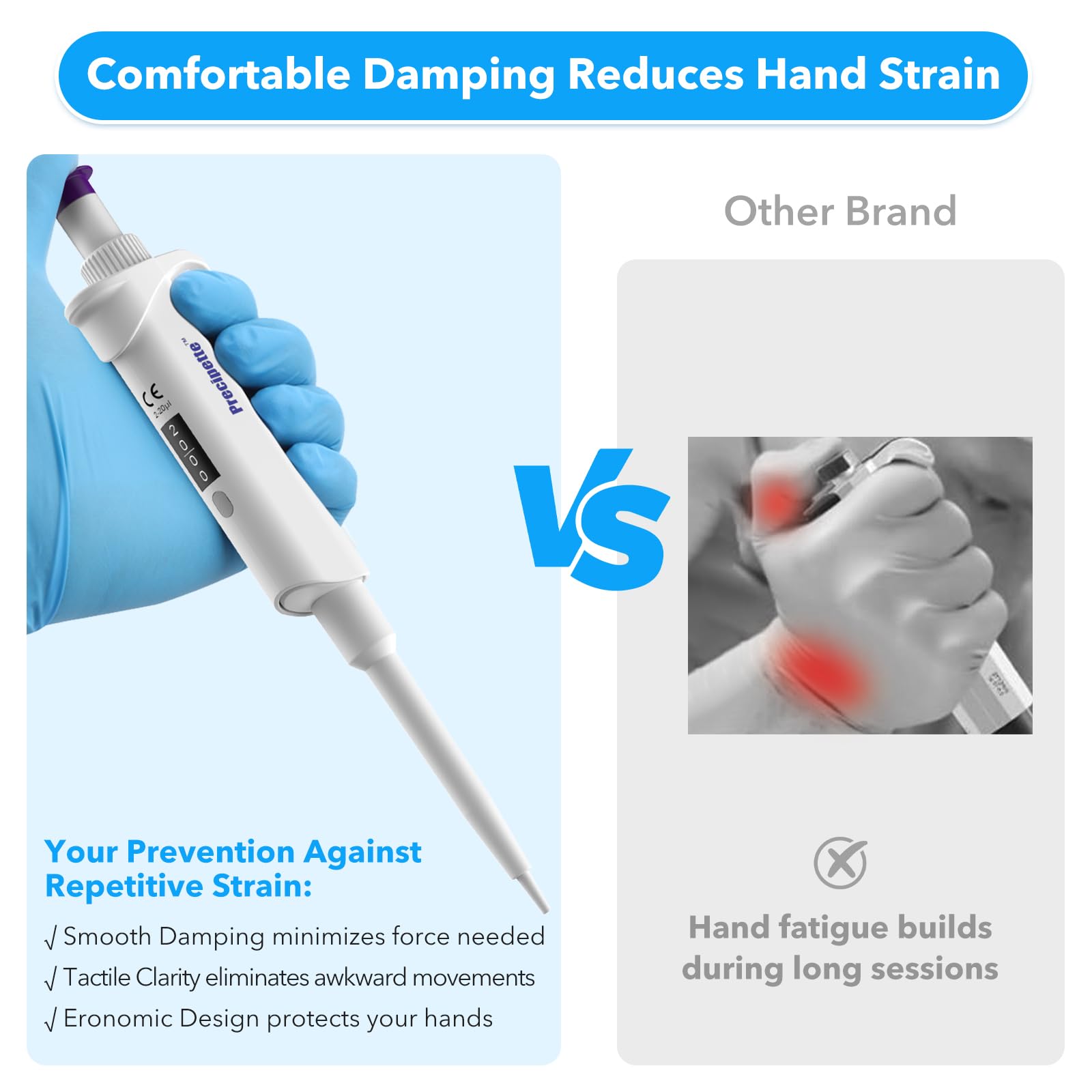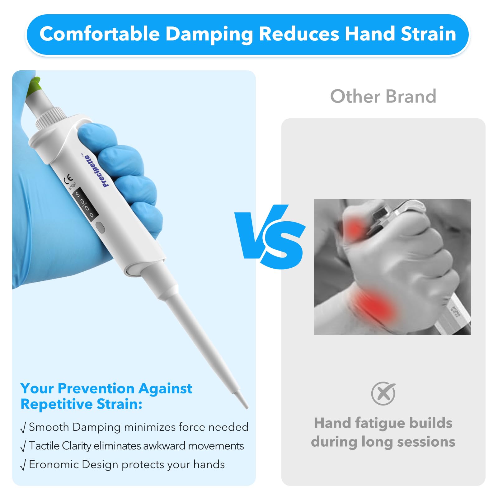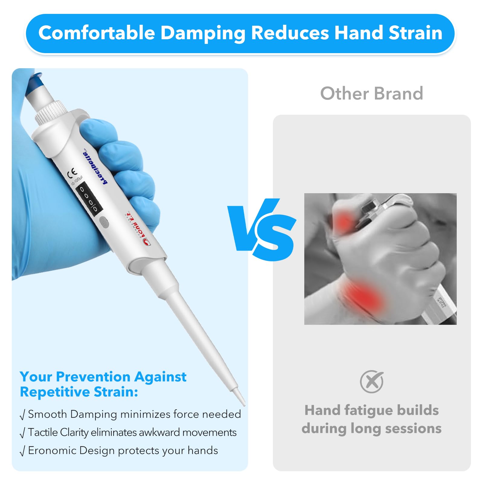 - Ergonomic Pipette Design (70g): Ultra-lightweight construction minimizes fatigue during extended use. The contoured shape ensures a secure, comfortable grip, while the internal SUS304 stainless steel spring enables smooth pipette operation with low button force, reducing the risk of Repetitive Stress Injury (RSI)