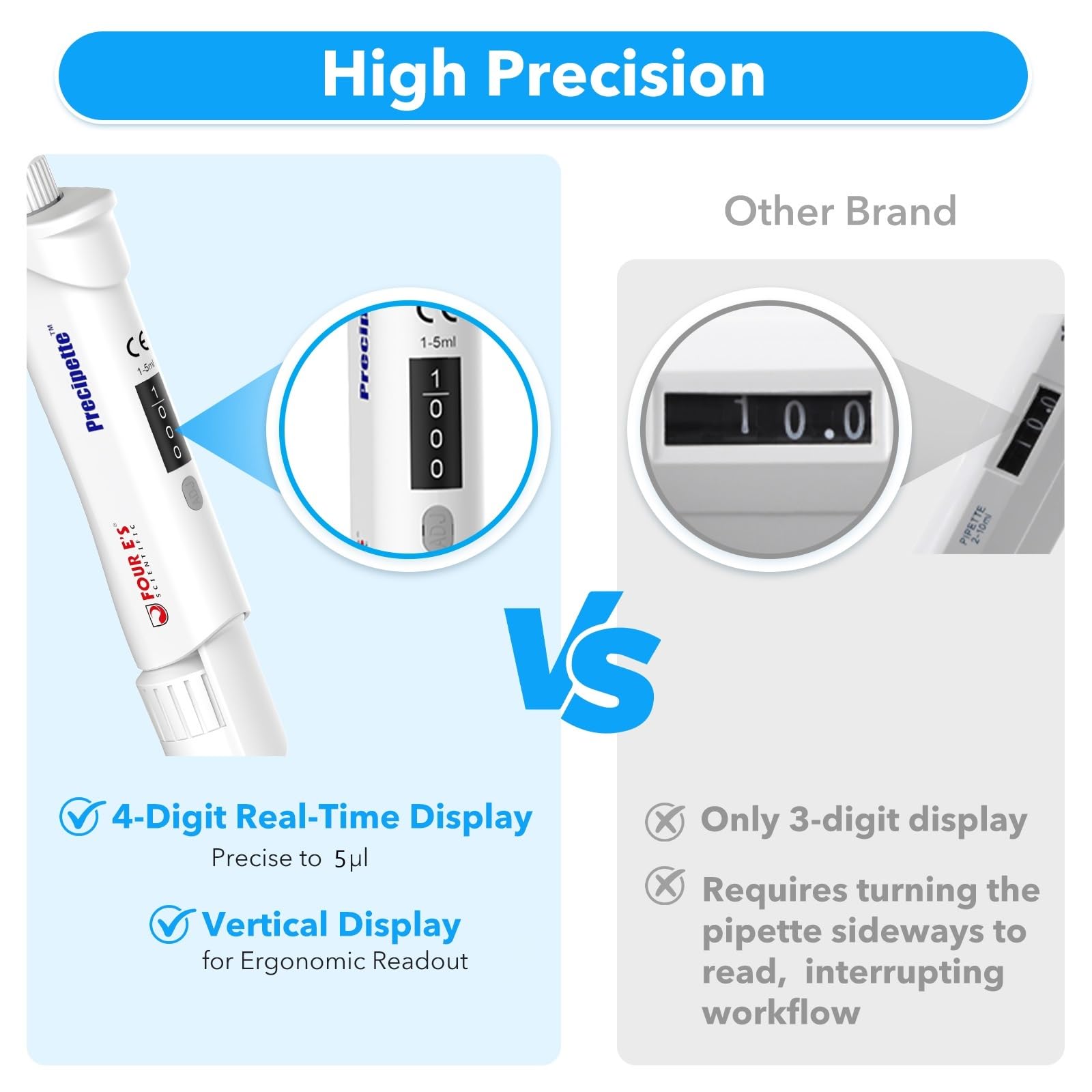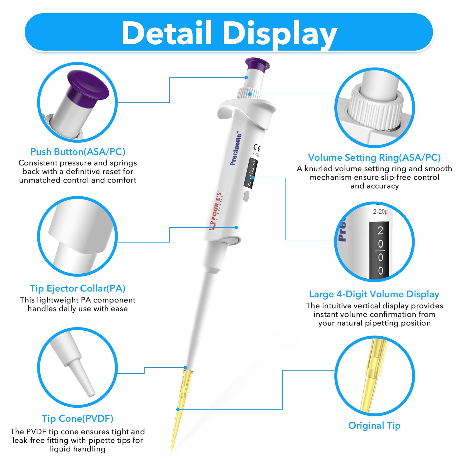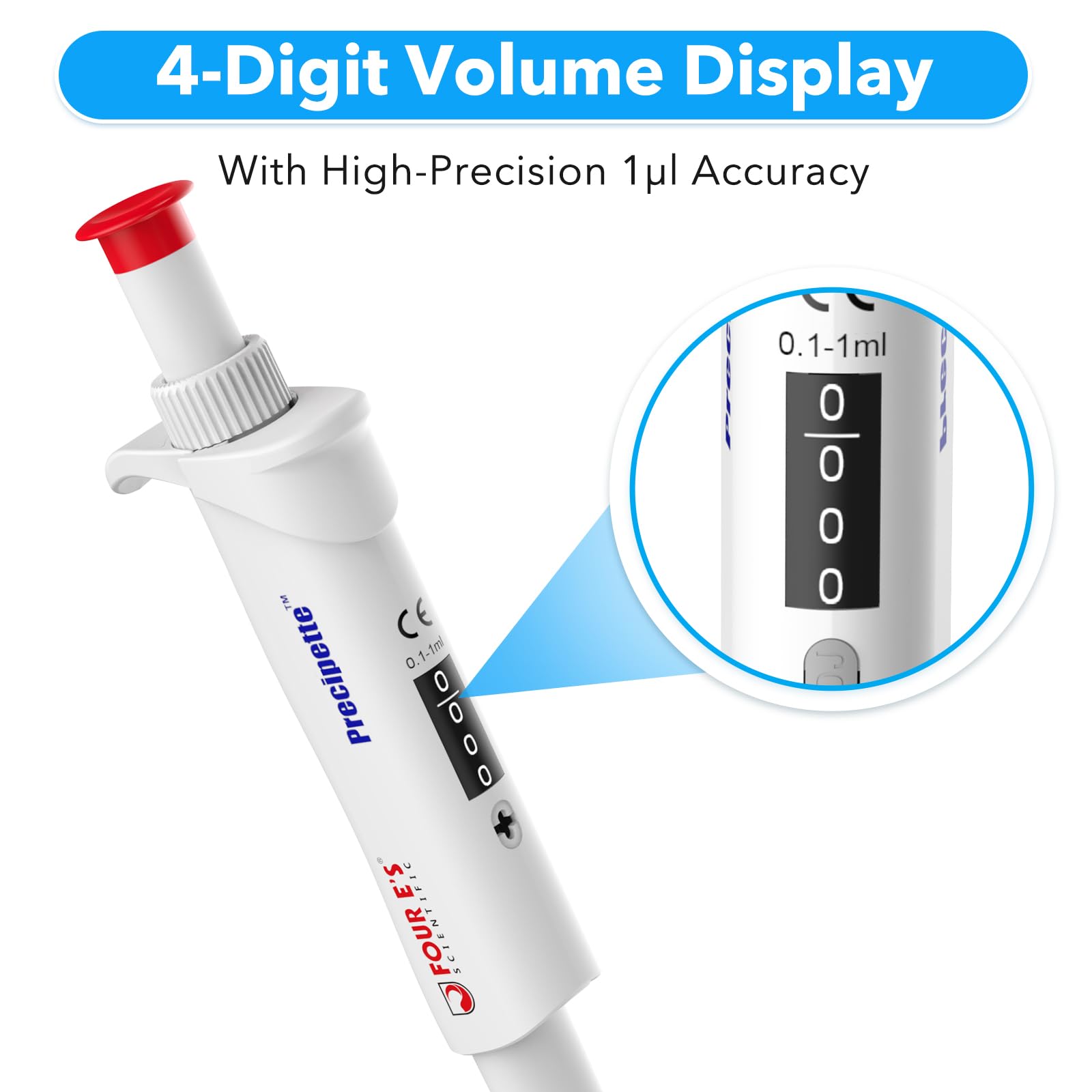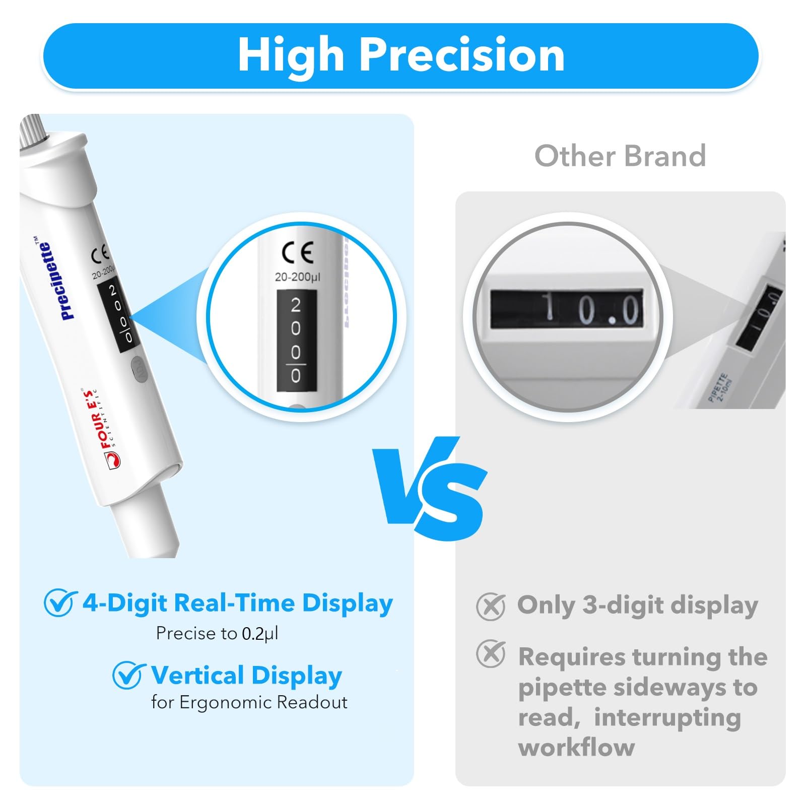 - Precise Volume Control: With a dispensing volume range of 20-200μl in 0.2μl increments, this pipette features a large, easy-to-read 4-digit display for superior precision compared to standard 3-digit screens, and is compatible with most universal pipette tips
