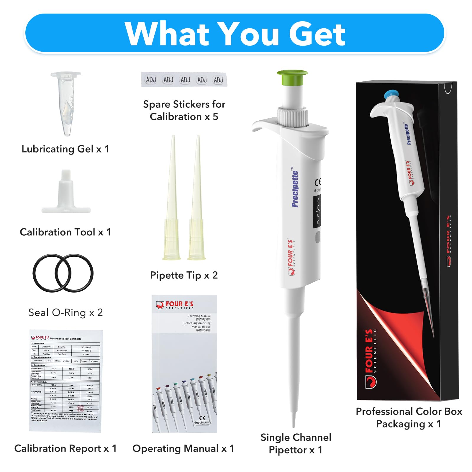 FOUR E'S SCIENTIFIC 20-200μL Pipette, Professional Single-Channel Pipettor Lightweight High Accurate Adjustable Variable Volume Micro Pipette with Calibration Certificate (Model LH0301006)