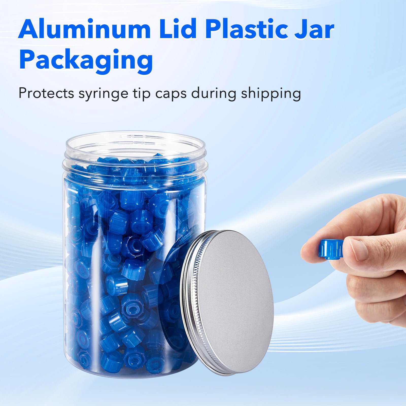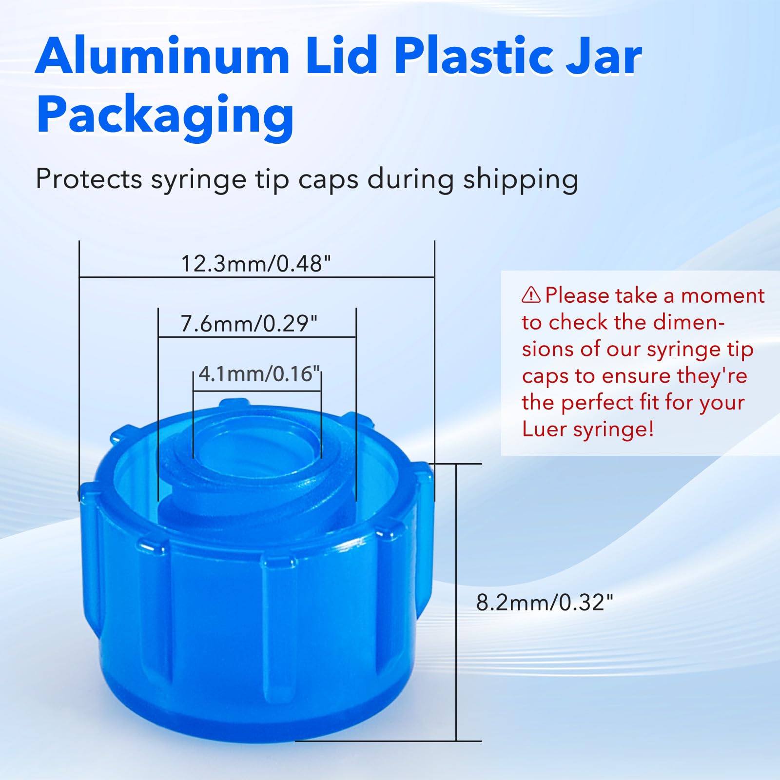 - Bulk Packaging in Plastic Jars: Conveniently packaged in a sturdy aluminum-lid plastic jar, each container holds 300 syringe tip caps, offering easy storage, organization, and protection against dust and damage