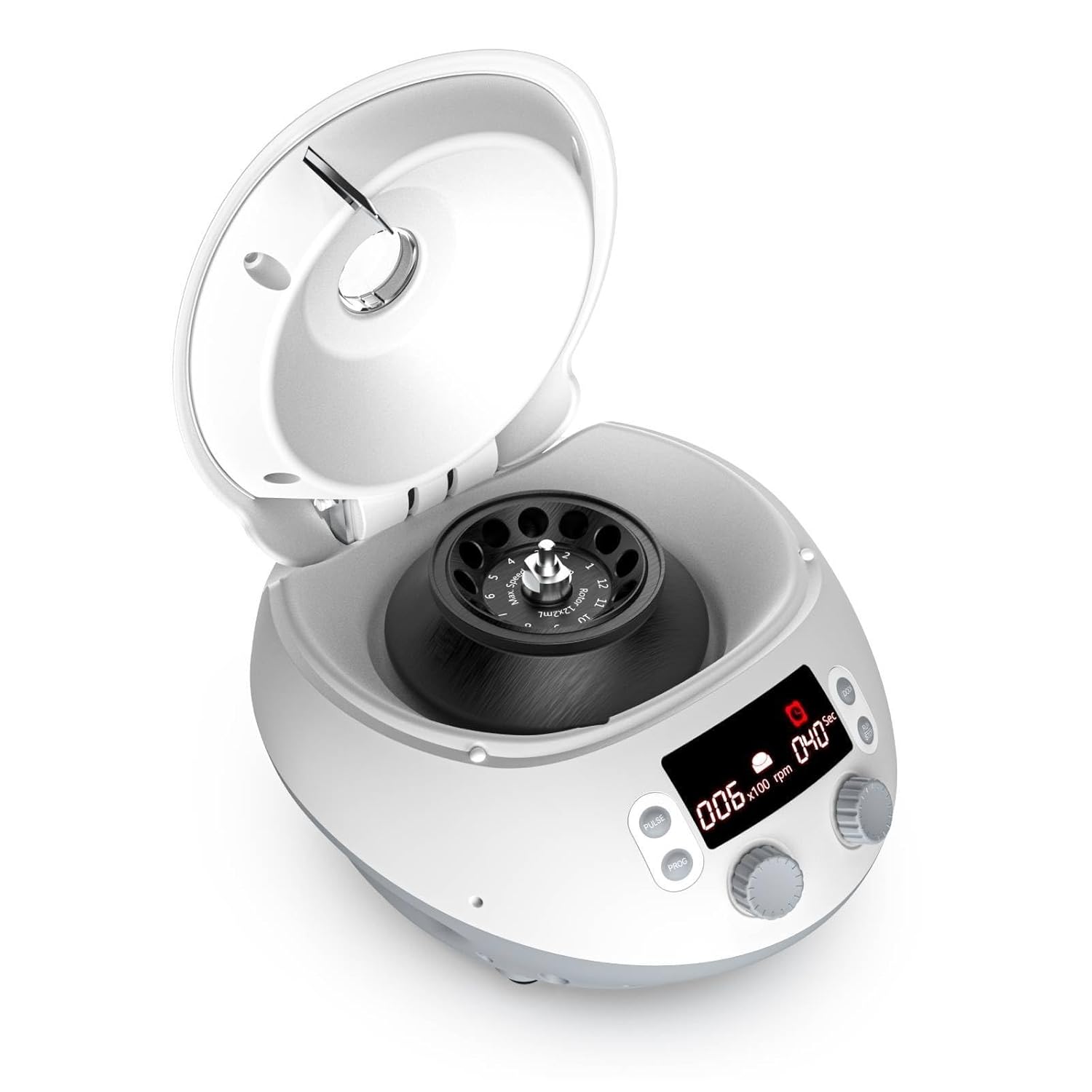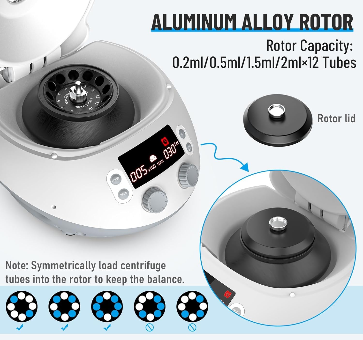 - High-Capacity: Our centrifuge features an aluminum alloy rotor with 12 positions, capable of fitting vessels in sizes of 2mL, 1.5mL, 0.5mL, and 0.2mL