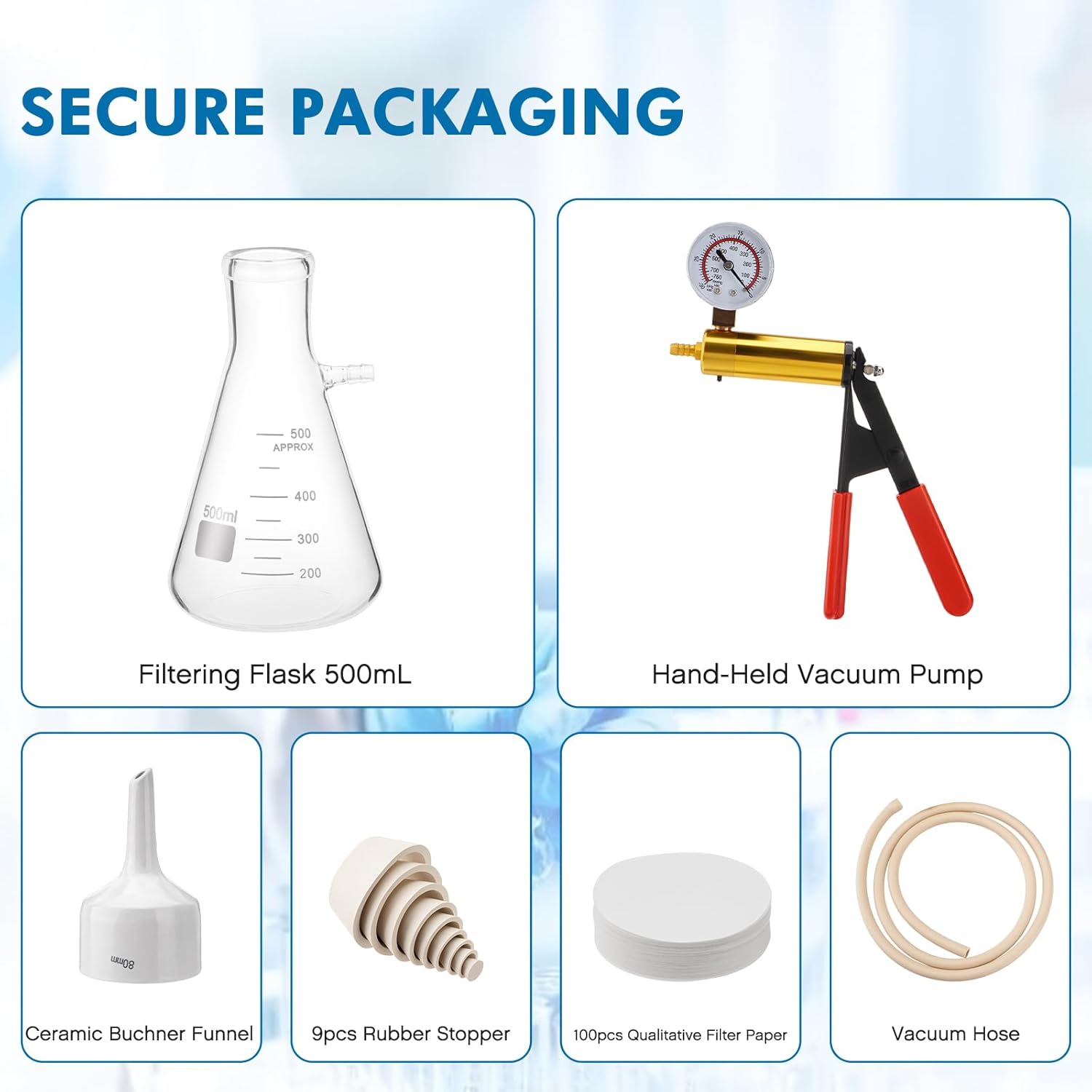 - Complete Filtering Kit: It includes a 500ml fltering flask, ceramic Buchner funnel, manual vacuum pump, 9 rubber stoppers and 100 filter papers