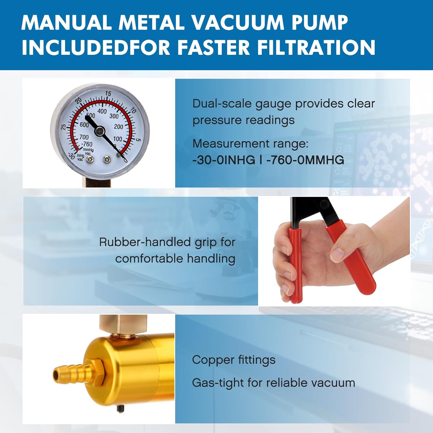 - Efficient Filtration: Equipped with a metal vacuum hand pump, it accelerates filtration efficiently, reducing time by up to 50% with easy operation for lab and industrial use