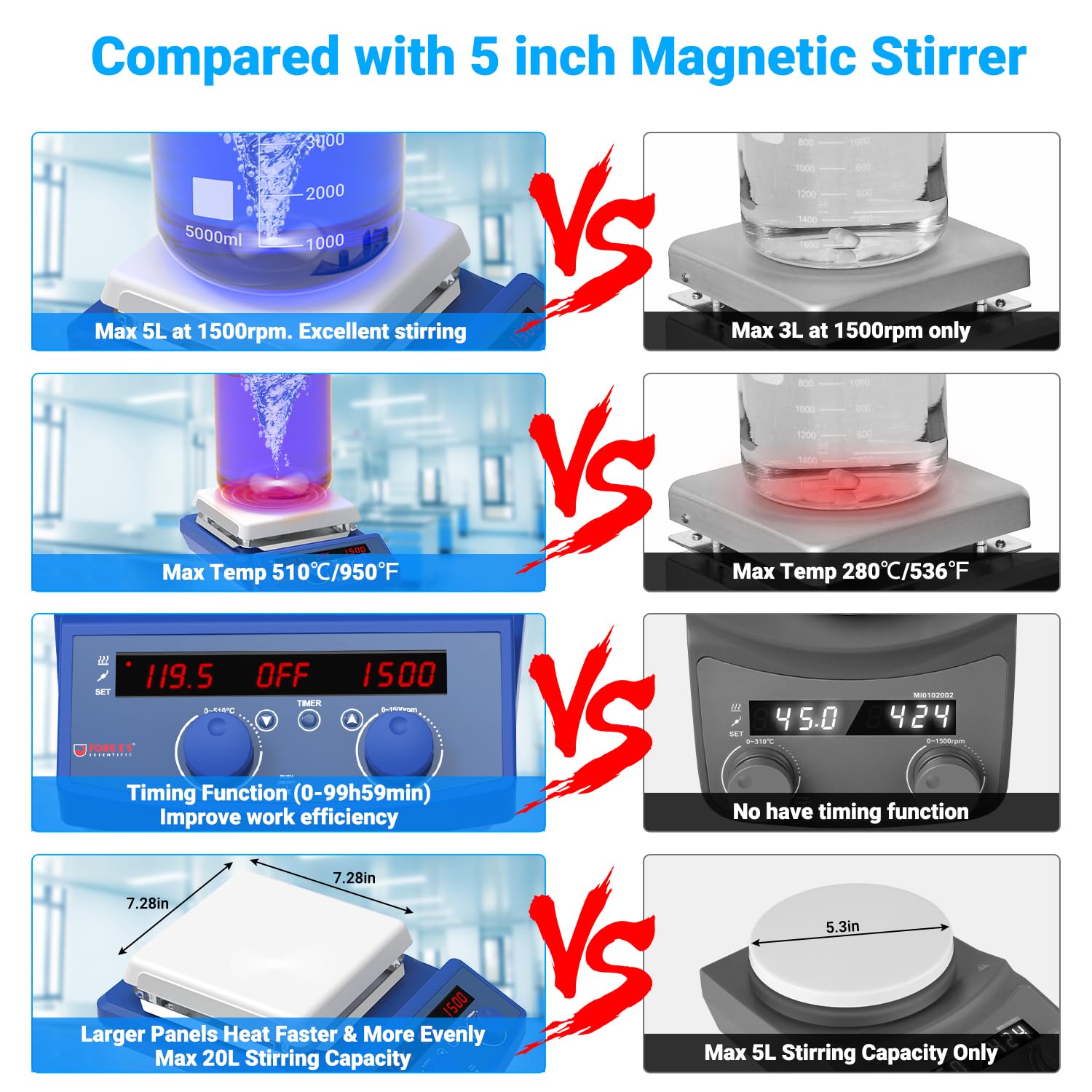 FOUR E'S SCIENTIFIC 510℃/950°F 7 Inch Magnetic Stirrer Hot Plate with Timer Function, 50-1500RPM, Max 20L Stirring Capacity, with Stand, Stir Bar Retriever, Temp Probe Sensor, 4pcs Stir Bars, 110V