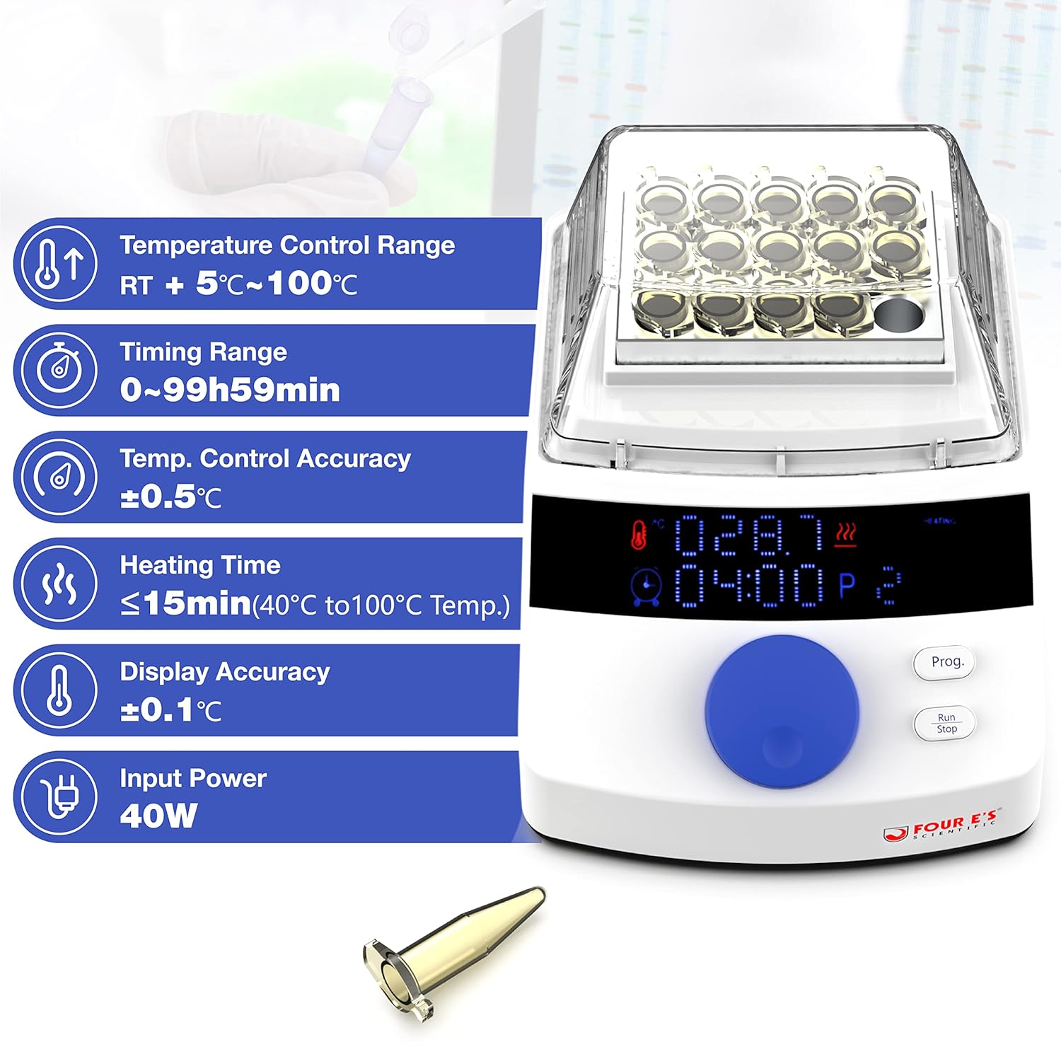 FOUR E'S SCIENTIFIC Mini Digital Dry Bath Incubator with Clear Lid, 15 x 1.5ml Heating Block with Timing Control, Up to 212℉/100℃, ± 0.5°C Accuracy