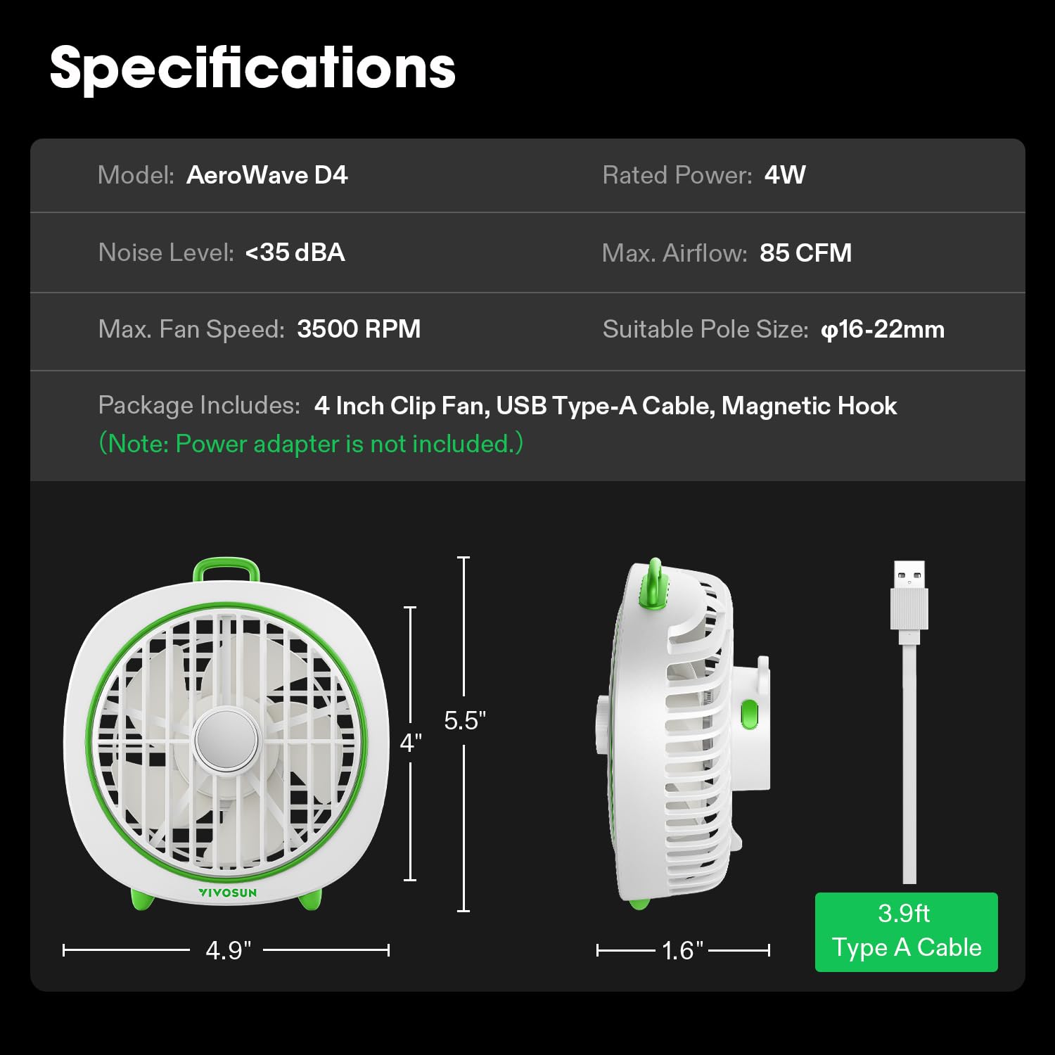 VIVOSUN AeroWave D4, 4” Grow Tent Clip Fan with Detachable Hook, 3-Speed Strong & Quiet Airflow, Adjustable Airflow Angle for Hydroponics, Circulation & Cooling, Black, 2-Pack