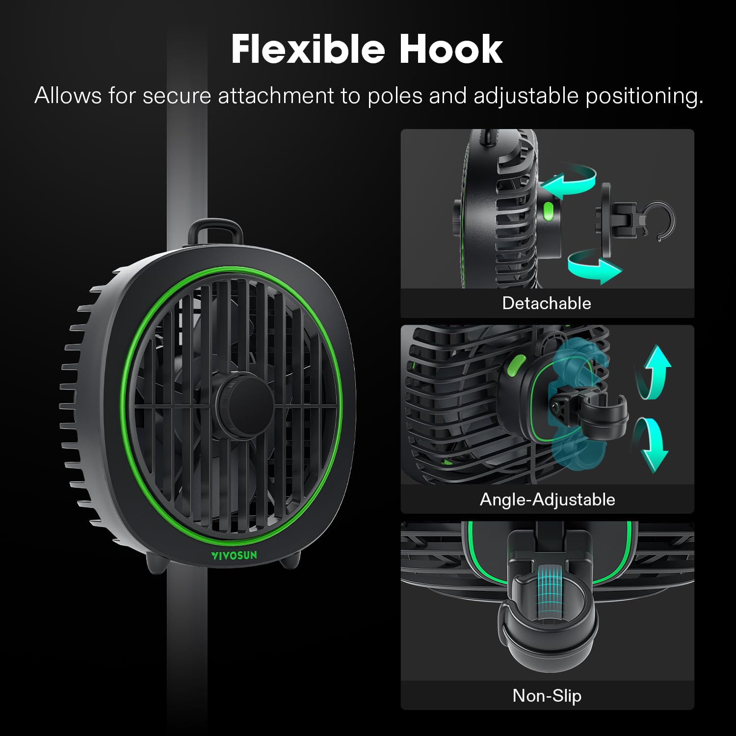 - Flexible Hook: A detachable and angle-adjustable hook on the back of this mini DC electric fan allows for secure attachment to poles and adjustable positioning; By changing the hook's angle, you can flexibly direct airflow in different directions
