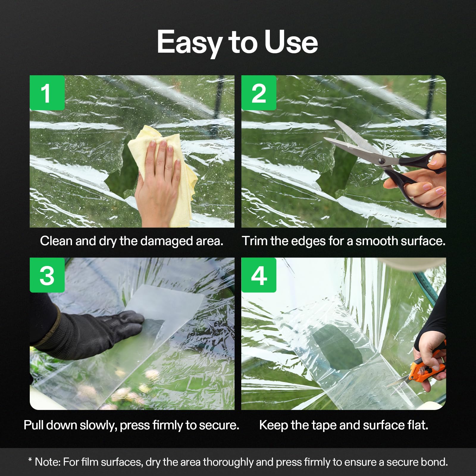 - Easy to Use: Clean and dry the damaged area thoroughly; Trim the edges of the damaged section for a smooth surface; Apply the tape and press firmly for a secure bond; For larger splits, apply multiple layers or cover both sides to create a complete seal; Restore your old greenhouse to like-new condition in just minutes