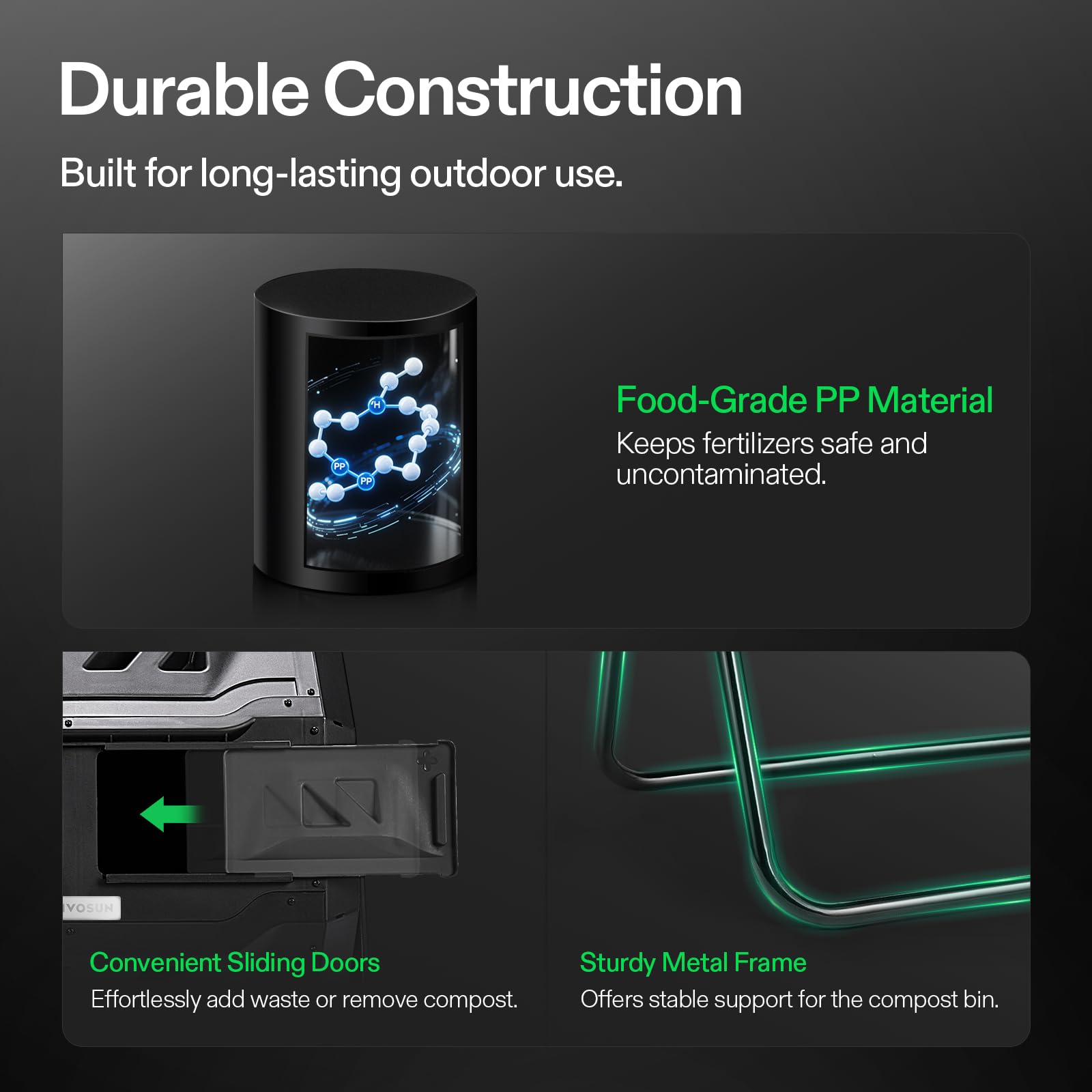 - Twin chambers: Two separate chambers allow one side to finish composting while leaving the other side available to add fresh wastes; Constant alternation of the two sides will create an uninterrupted stream of nutritious compost