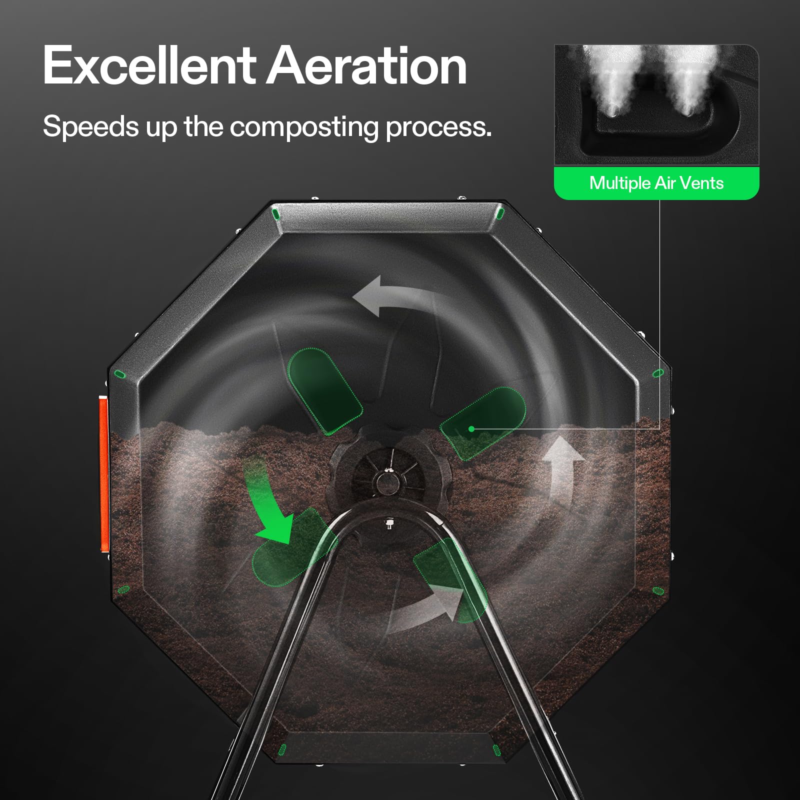 - 360⁰ Tumbling Design: The rotating design prevents you from digging or mixing the pile by hand; And the deep fins on eight panels make it easier to turn the compost bin